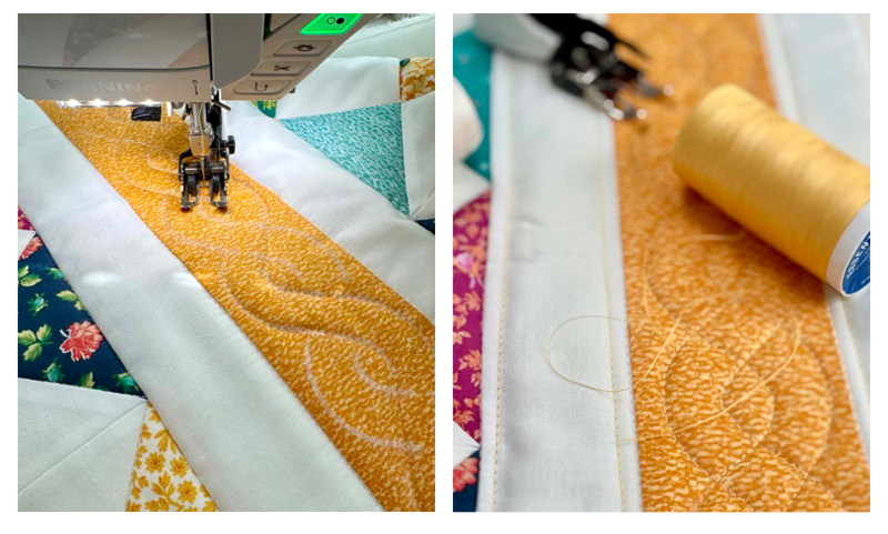 The final sections to quilt were the white bands running down the center. I chose a feather design for this space and the only thing I marked was the center spine. I used the lemon chiffon thread color (I was feeling brave) for a little contrast.