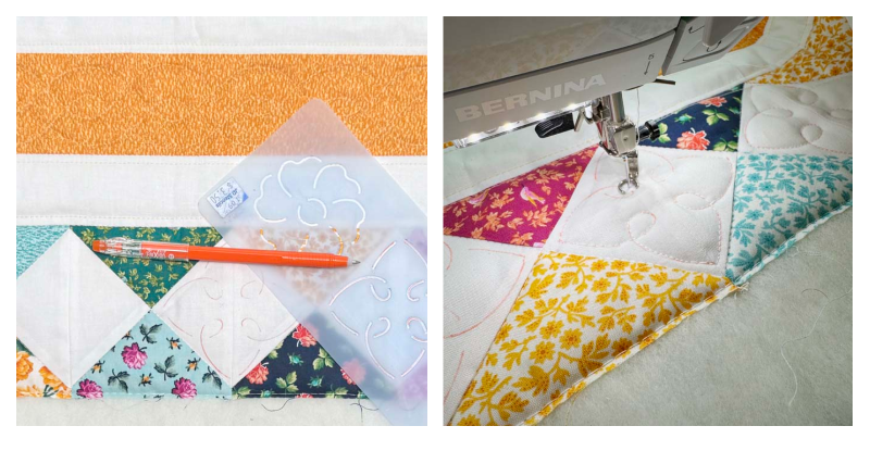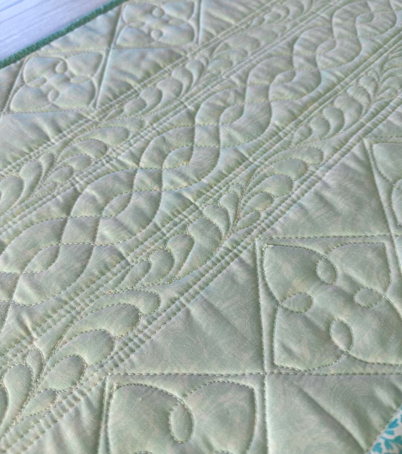 I used another stencil to quilt the white square spaces along both long sides. I used the ivory thread color and free motion quilted each motif. This is such an easy design to stitch and the size was perfect.