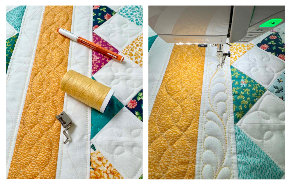 I used the walking foot again to stitch a cable design in the center yellow strip. It would have been fine to do this free motion, but I wanted to use the walking foot in an open area. I marked the design using a stencil and chalk powder. I used the lemon chiffon color for this section, and it turned out great.