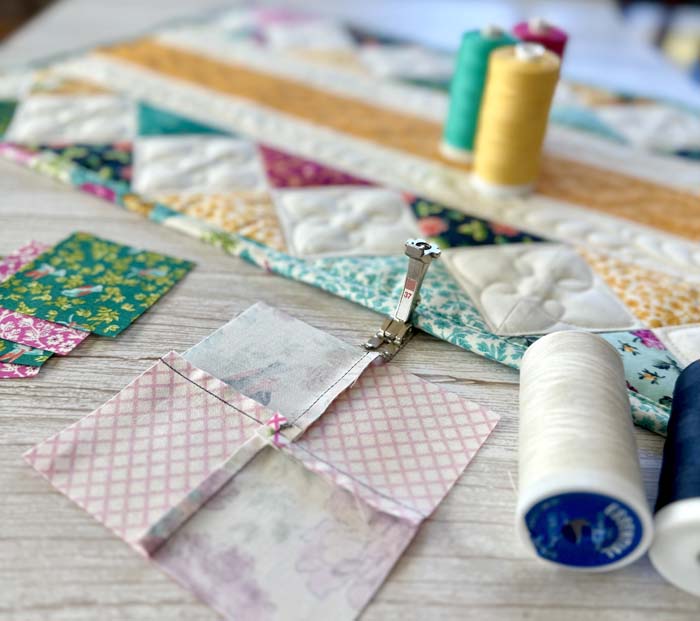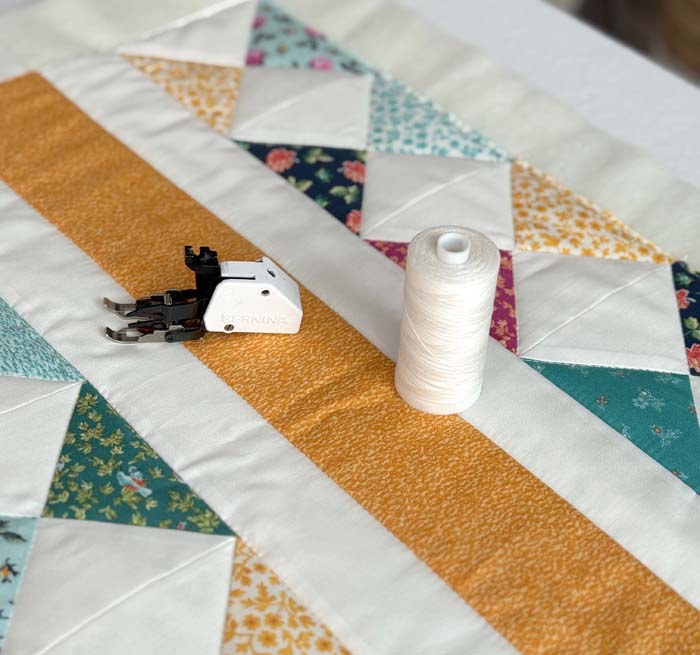 I made a small quilt top from scraps that needed to be quilted and it was perfect for testing out Essential Threads. The first part was stitching in the ditch (seam) using a walking foot. I often do this when I want blocks to have definition and to further stabilize the quilt.