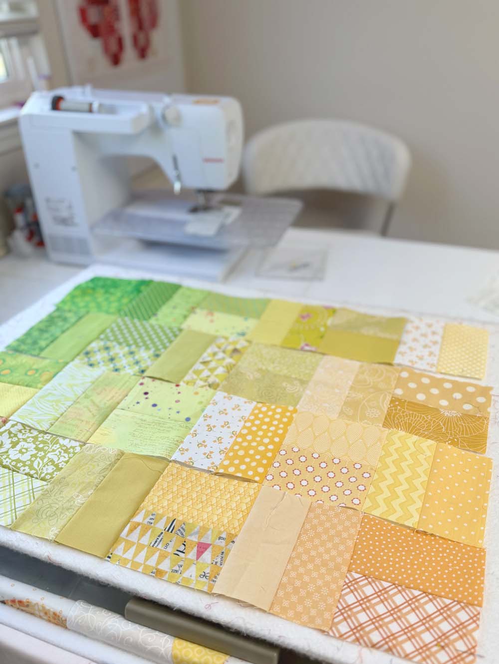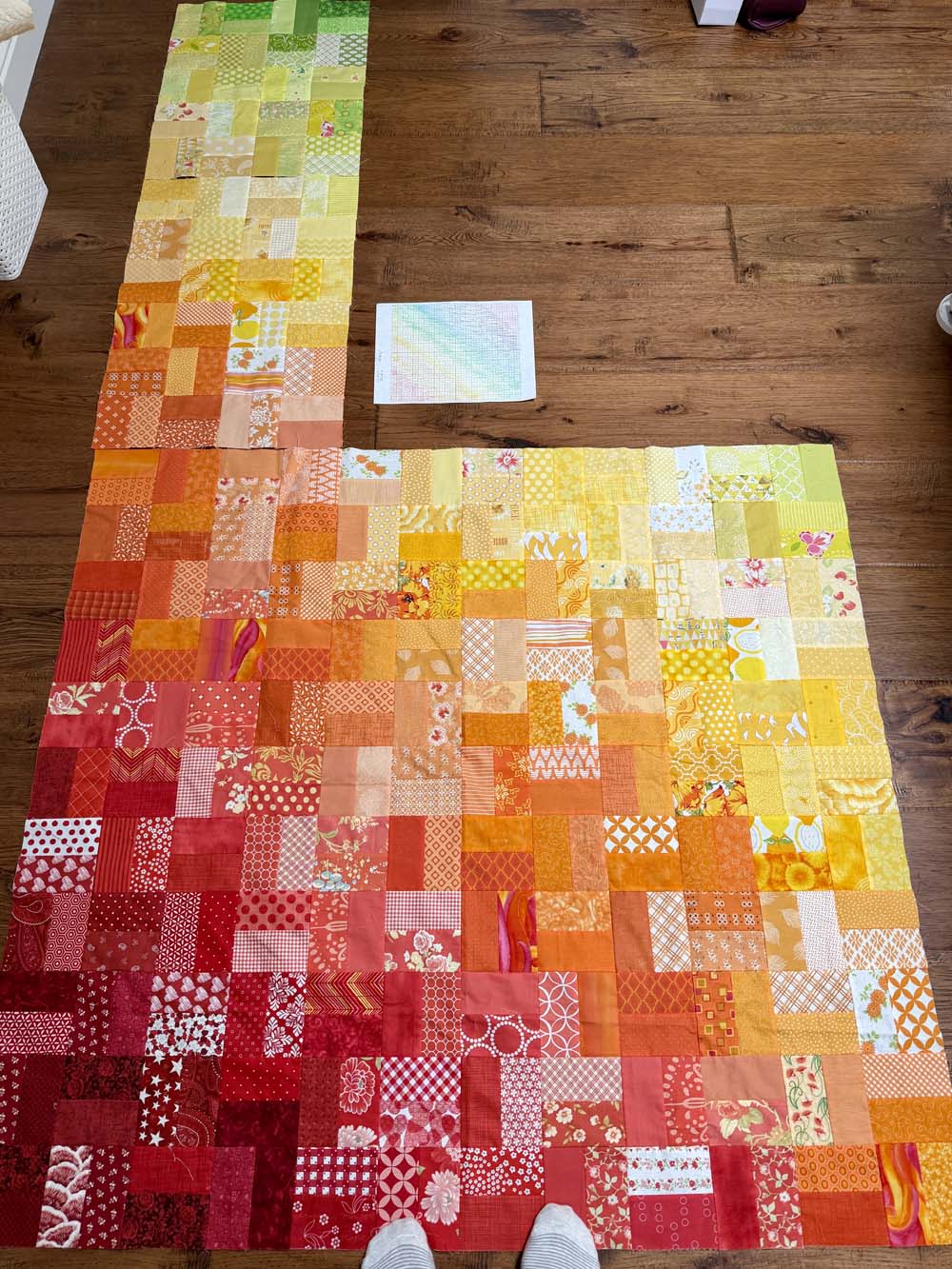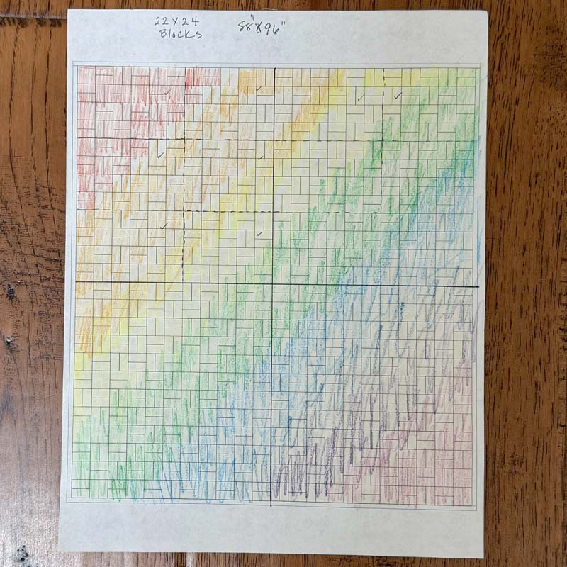 This is going to be a large rainbow scrap quilt. If I’m lucky, I’ll finish it in the year 2030! I used graph paper to make a road map and I’ve divided it into sections. I mark off each section as I finish it. I’m not even done with the top half.