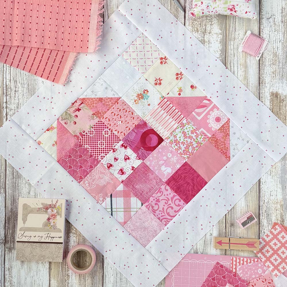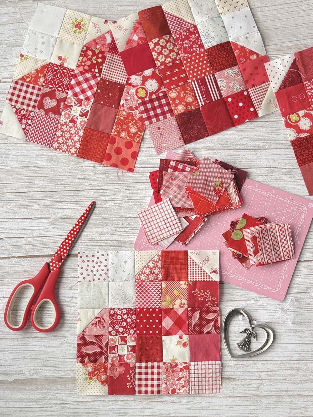 My newest project is a scrappy heart block made with red and white scraps. It’s super fun and easy, and I’ll have a full tutorial for you next week! The quilt block will come with two size options. It’s the perfect project to use up scraps in any color.