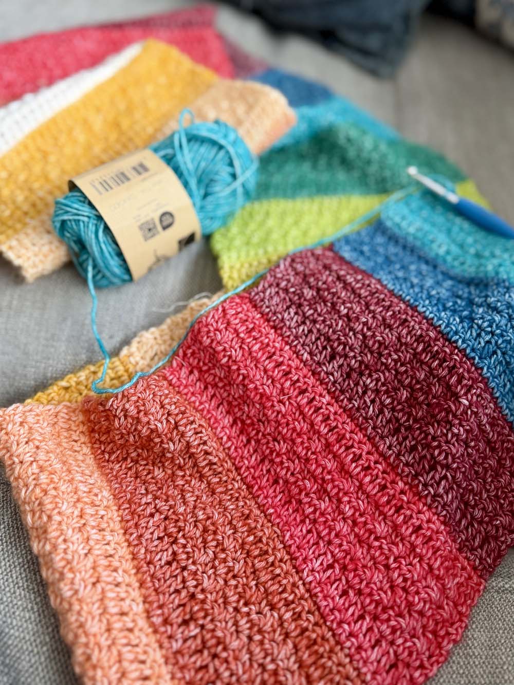 I currently have two couch projects I’m working on. I call these couch projects because I can work on them as I sit on the couch at night while watching TV. I tell myself this qualifies as multi-tasking so I can justify two hours of couch potato time. I am almost finished crocheting my Lemonade Scarf. This is a rainbow scarf (apparently I can’t get enough), and it’s so much fun! I used nine different colors of Scheepjes Stonewashed Yarn which is a cotton and acrylic blend.