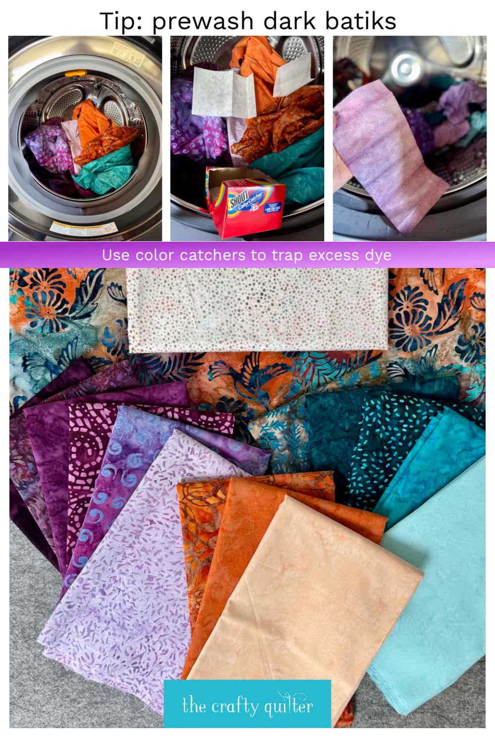 I recently started a new quilt project using all batik fabric. The colors range from deep purple, teal blue and orange along with a light background fabric. I prewashed the dark color batiks and used two Shout Color Catchers (available at most supermarkets). The color catchers turned purple, so they worked to trap the excess dye that was in the water.