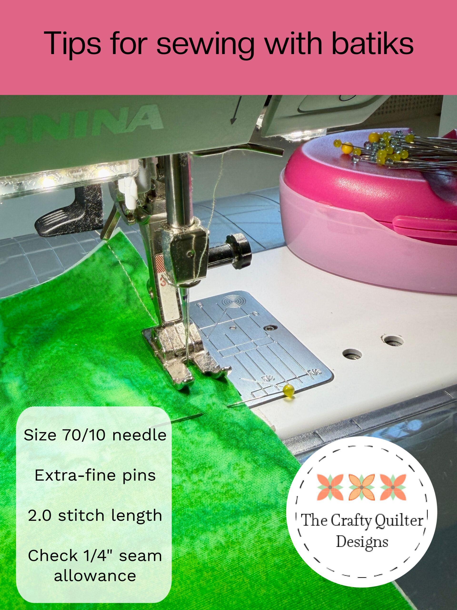 - Extra fine pins glide easily through batiks. My favorite is Clover extra fine patchwork pins.