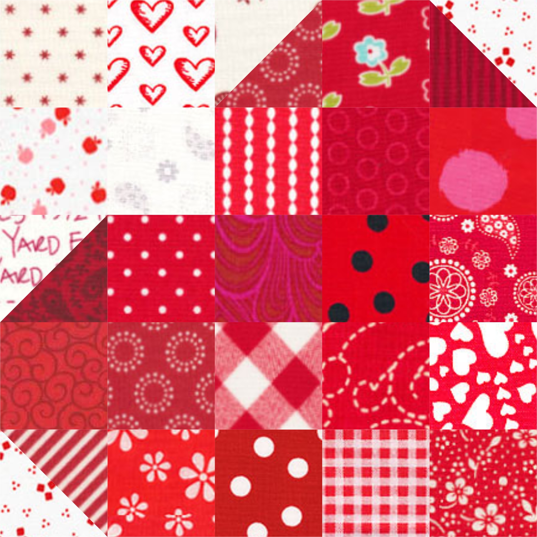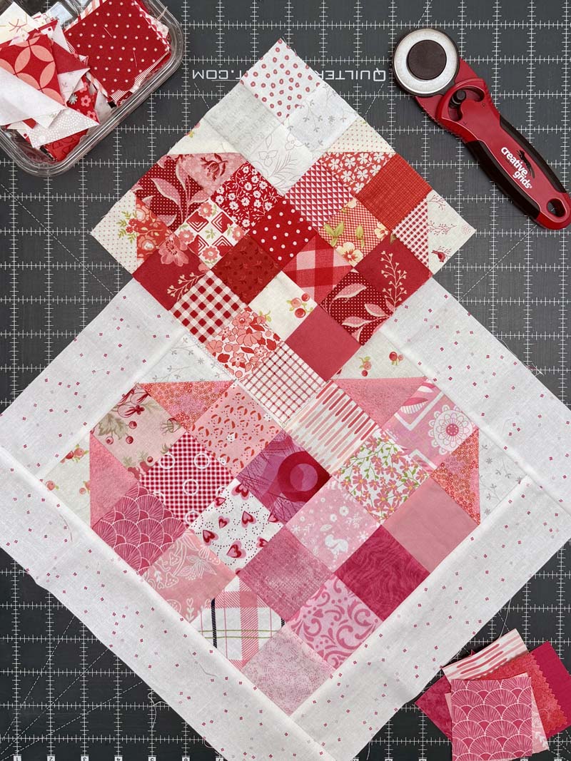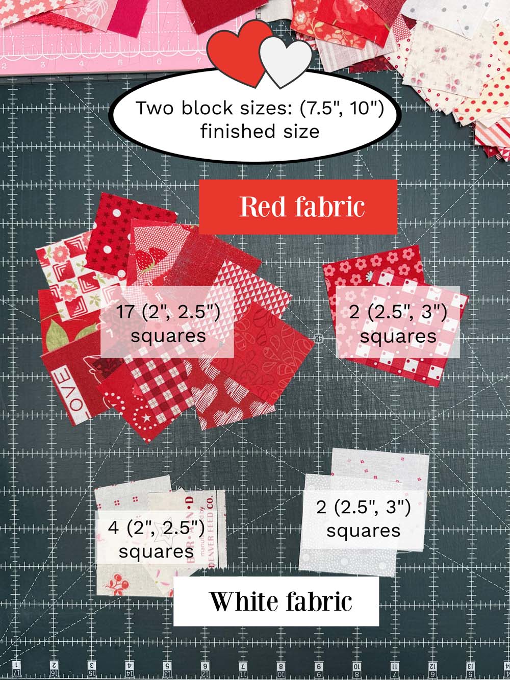 You’ll need red and/or pink fabric scraps ranging from medium to dark with a minimum size of 2.5″ square. For the background (white) fabric, you can use low volume prints, solids or white on white. The same size requirement applies. A charm pack or mini charm pack can be used for both sizes as well. You don’t need to limit yourself to a red and white color scheme. You could aways make a rainbow of hearts if that’s what makes your heart sing!