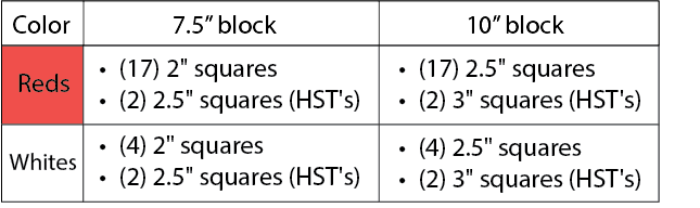 Use the chart below to cut fabrics for your desired block size: 7.5″ or 10″ (finished).