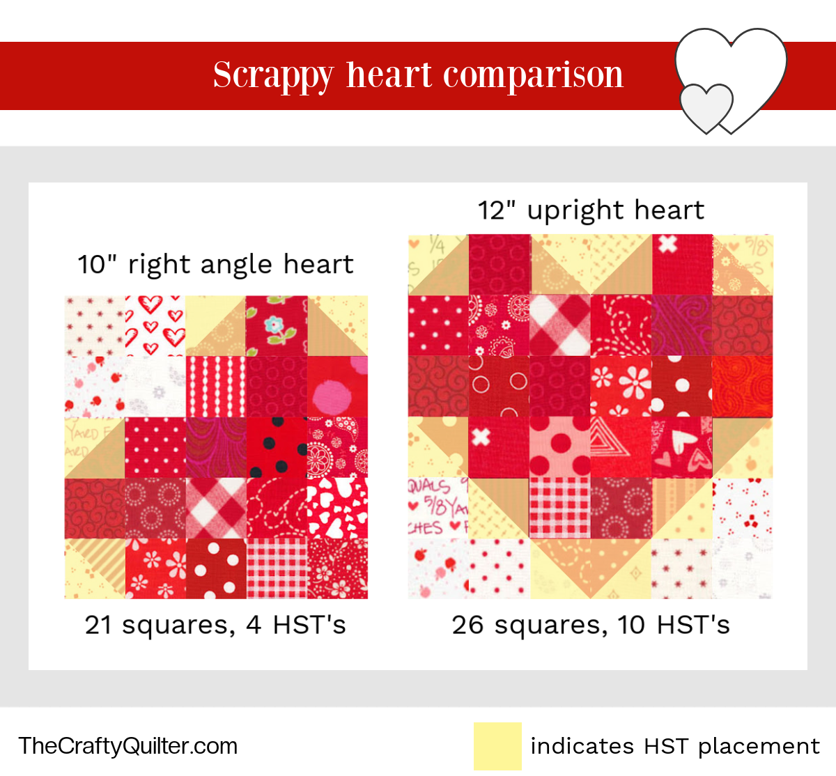 One thing you’ll notice is this heart block creates a heart that is not standing straight up. It’s resting on its side, at a right angle. It looks lazy to me, thus the name. 🙂 I designed the block this way because it eliminates (6) extra half-square triangles (HST’s) and because it’s a little more unique and playful. Below, you can see the comparison between the two types of blocks and where the HST’s are placed.